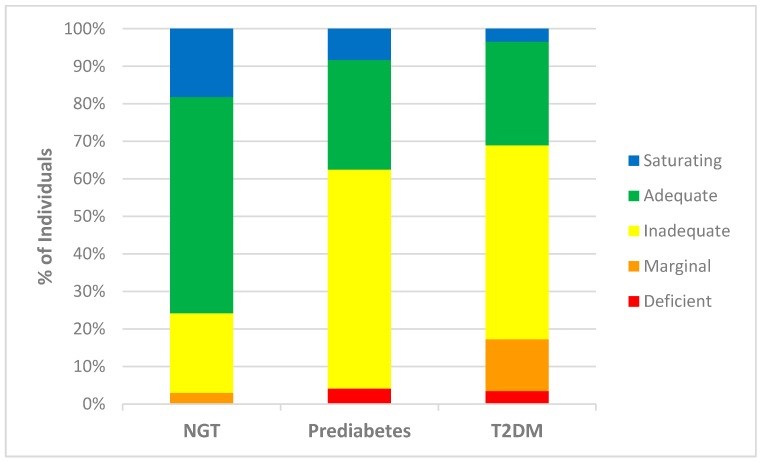 Vitamine C-plasmaconcentraties bij deelnemers met een normale bloedgucosespiegel (NGT = Normal Glucose Tolerance), deelnemers met prediabetes en deelnemers met diabetes type 2.www.ncbi.nlm.nih.gov
