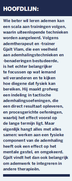Geen wonder dan ook dat de belangstelling voor uiteenlopende ademhalingstechnieken de laatste jaren sterk toeneemt. Wie met de ademhaling wil werken, kan een scala aan trainingen volgen, zoals onder andere Holotropic breath, Oxygen advantage, Buteyko, Ademretenties of Rebirthing. Gjalt Vlam, ademtherapeut en -trainer, heeft verschillende ademhalingstechnieken grondig bestudeerd en ziet al die verschillende namen vooral als marketing. ‘Uiteindelijk zijn er maar een paar technieken, zo veel parameters waar je mee kunt variëren zijn er niet. Belangrijker dan welke techniek het beste zou zijn, is beseffen waar de cliënt zich bevindt, wat deze precies wil bereiken en welke verandering in de ademhaling daarvoor van belang is’, legt hij uit. Ademhaling heeft zowel een fysieke als een mentale/emotionele component, en deze beïnvloeden elkaar voortdurend. Als de sympathicus actief is, is de ademhaling heel anders dan wanneer de parasympathicus de boventoon voert. ‘Fysieke activiteit is van invloed op de snelheid, het volume en de locatie van de ademhaling. Maar ook emoties en gedachten veranderen de ademhaling. Op al die terreinen geldt dat de communicatie twee kanten op gaat. Een rustige ademhaling ontspant het lijf en ook de geest. En we gebruiken onze ademhaling ook om de emotie te reguleren. Denk aan de zucht van verlichting na een lange werkdag of een intens gesprek. Er is dus voortdurende wederzijdse beïnvloeding tussen het fysieke, mentale en emotionele vlak.’