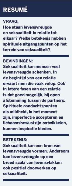 Seksualiteit kan veel voor de levensvreugde van mensen betekenen. We beschikken ermee over een mooie mogelijkheid om van het leven te genieten, verbondenheid en vitaliteit te ervaren en een scala aan avonturen te beleven. Liefdevol en levendig is daarbij voor veel mensen het ideaal. Een vrouw van 47: ‘Op een of andere manier voel ik me meestal helemaal thuis, met mijn geliefde in bed. Heerlijk vind ik het als je al je kleren uitgetrokken hebt en volkomen met elkaar in verbinding komt. Alleen nog maar ervaren. En tintelend elkaar beleven.’