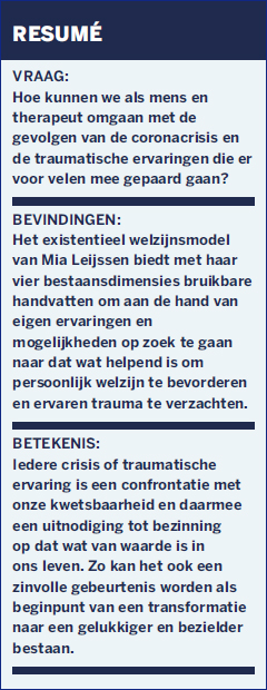 De laatste periode van haar carrière spitste prof. dr. Mia Leijssen, emeritus-hoogleraar Klinische Psychologie en Psychotherapie aan de Katholieke Universiteit in Leuven, haar onderzoek toe op ‘dat wat wezenlijk is voor ons mens-zijn’. Vanuit de positieve psychologie onderzocht ze de vraag waar wij als mensen beter van worden, hoe we een gelukkiger en zinvoller leven ontwikkelen, ondanks en soms dankzij de beperkingen die we op ons levenspad tegen komen. Ze schreef hier de boeken ‘Tijd voor de ziel’1 en ‘Leven vanuit liefde. Een pad naar existentieel welzijn’2 over en ontwikkelde de onlineopleiding Counseling Existentieel Welzijn.
