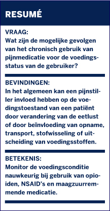 Medicijngebruik is altijd van invloed op de stofwisseling en voedingsconditie van de gebruiker. Dit hoeft geen probleem te zijn, maar bij de behandeling van chronische pijn met analgetica, is het zinvol alert te zijn op achteruitgang in de voedingsstatus. Want de risico’s van negatieve interacties op de voedingsstatus zijn vooral groot bij chronisch gebruik van pijnstillende geneesmiddelen en bij het gebruik van meerdere geneesmiddelen tegelijkertijd (polyfarmacie). Bovendien is de pijndrempel van patiënten met pijn bij een goede voedingsconditie hoger.1