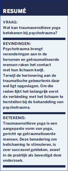 De essentie van (psycho)trauma is dat het overweldigend, ongelooflijk en ondraaglijk is, zo stelt psychiater Bessel van der Kolk in zijn boek ‘Traumasporen’.1 Verschrikkelijke gebeurtenissen als oorlog, mishandeling, verkrachting, misbruik of een ernstig verkeersongeval kunnen niet ongedaan gemaakt worden. Wat wél kan worden aangepakt, zijn de sporen die het trauma heeft achtergelaten in lichaam, geest en ziel. De benadering via het lichaam blijkt daarbij zeer goede resultaten te hebben. Van der Kolk ontwierp er samen met yogaleraar David Emerson een yogamethode voor: traumasensitieve yoga.