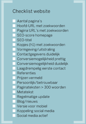 Ik heb de sites met veel plezier bekeken en beoordeeld op de criteria die je hieronder in de checklist vindt. Sommige van die criteria zijn harder dan andere. Of er zoekwoorden in de URL staan, is voor iedereen duidelijk. Wat een prettige conversiemogelijkheid is en wat precies betrouwbaar is, dat wisselt per persoon of in elk geval per doelgroep en doel. Ik ben bij mijn analyse uitgegaan van een gemiddeld tot hoger opgeleide man/vrouw van circa 45 jaar met gemiddelde internetvaardigheden, die op zoek is naar een oplossing voor zijn/haar klacht en ‘blanco’ de website bezoekt, dus nog niet eerder contact heeft gehad met de behandelaar achter de website. Marketing- en internetdeskundigen leren ons dat zij niet direct willen bellen voor een afspraak, maar wel meer lezen, chatten of mailen. Misschien willen ze ook wel wat tips ontvangen per mail of in een download. Of eens aan je snuffelen tijdens een lezing of optreden op locatie.