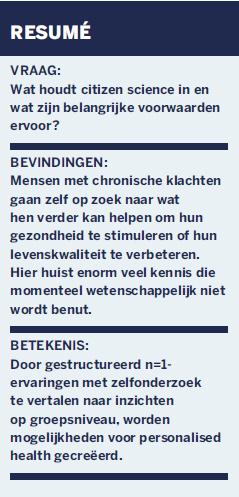 Vanuit die motivatie richtte hij in 2015 het Platform Patiënt en Voeding op, met als missie voeding tot een erkende medische interventie- en preventiestrategie te maken, met een grote rol voor ervaringskennis van patiënten. ‘Of ze nou reuma, hartklachten, hoofdpijn of kanker hebben, ze zien dat voeding en leefstijl iets met ze doet. Ik vroeg me af hoe we onze eigen kennis op een hoger plan zouden kunnen trekken.’ Middels de symposia ‘BeyondRCT’ leidde het tot een zoektocht naar nieuwe burgergedreven onderzoeksmethoden die verder gaan dan de klassieke gouden standaard van dubbelblind onderzoek in de medische wereld. Daaruit volgde de noodzaak ook het databeheer te herorganiseren vanuit burger- en patiëntenperspectief. En zo ontstond de stichting Mijn Data Onze Gezondheid (MD|OG), gericht op het gegeven dat individuele data belangrijk kunnen zijn voor ieders gezondheid, en dat de regie van burgers over genereren en beheer ervan essentieel is. De verbindende term waaronder dit alles valt, is ‘citizen science’ ofwel burgerwetenschap.