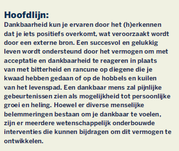 De meeste mensen hebben wel een gevoel bij de betekenis van dankbaarheid. Wetenschappers hebben kaders ontwikkeld om dankbaarheid te kunnen onderzoeken. Zo hebben Emmons en McCullough dankbaarheid gedefinieerd als een proces in twee stappen waarbij je ten eerste (h)erkent dat er iets positief is gebeurd en vervolgens erkent dat dit van een externe bron komt. Die externe bron kan een ander mens zijn maar ook iets groters zoals ‘de natuur’, ‘het lot’ of ‘God’.
