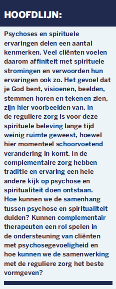 Mensen met psychoses ervaren vaak een duidelijke overlap met spirituele ervaringen.1,2 Wat in de reguliere zorg wordt gezien als hallucinatie, kan worden ervaren als een visioen, een waarneming van energie of een aanwezigheid in een andere dimensie. Stemmen kunnen een gevolg zijn van overprikkeling of van hersenprocessen, maar kunnen ook ervaren worden als behorend bij negatieve of positieve entiteiten, niet-geïntegreerde zelfdelen of echo’s van ouderstemmen uit de jeugd. Cliënten met psychoses vinden momenteel weinig ruimte voor hun spirituele ervaringen bij de reguliere zorg.1,2 Voorlopige resultaten uit onderzoek naar psychose en energetische therapie laten zien waar ze wél terecht komen: bij complementair behandelaars.