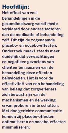 Het effect van veel behandelingen in de gezondheidszorg wordt vaak niet alleen verklaard door de werking van medicatie of de behandeling zelf. Onderzoek maakt steeds meer duidelijk dat zogenaamde placebo- en nocebo-effecten een grote invloed hebben op medische behandelingen. Het IPS hanteert de volgende definitie: Placebo- en nocebo-effecten zijn de veranderingen in patiëntuitkomsten die niet kunnen worden toegeschreven aan de werkzame ingrediënten van een voorgeschreven behandeling of het natuurlijk verloop van een aandoening, maar die kunnen worden verklaard door de verwachtingen die iemand heeft over de behandeling.