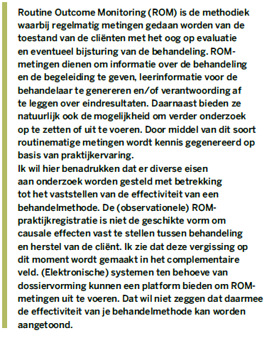 Als complementair behandelaar kun je de cliënt vragen de SF-36-lijst in te vullen voorafgaande aan een behandeling, bij ieder volgend consult en na afloop van de behandeling. Op die manier is de ontwikkeling in kwaliteit van leven over het verloop van je behandeling in kaart gebracht. Het systematisch meten wordt ook wel routinematig meten genoemd (Routine Outcome Monitoring, afgekort als ROM).