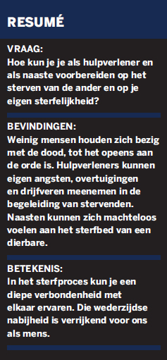 Eerlijk gezegd is het ook niet iets waar ik dagelijks mee bezig ben, mijn eigen sterfelijkheid. En ik heb – gelukkig – ook niet dagelijks met sterven van dierbaren te maken. Maar de laatste twee jaar wel vaker dan me lief is. Hoe doe je dat dan, je daar innerlijk op voorbereiden? Ineke: ‘Sterven is vrijkomen van alles waar wij in het leven houvast aan hebben, waar we ons mee identificeren: ons fysieke lichaam, onze rollen in het leven, onze gevoelens en emoties en onze opvattingen over wie we denken te zijn. Dat is nogal wat, maar hoe groter het verzet tegen dit loslaten, bewust of onbewust, hoe meer de kwaliteit van ons dagelijkse leven onder druk staat. Wat wij willen is dat mensen meer vertrouwd raken met sterven, omdat het een wezenlijk onderdeel is van het leven, in plaats van het te ontkennen of uit de weg te gaan. In het sterven is namelijk een grote intimiteit, een diepe verbondenheid te ervaren. Sterven raakt aan het mysterie, waarin een rijkdom aan kennis en wijsheid over het leven te ontdekken is. Als we in staat zijn elkaar daarin wederzijds nabij te zijn, dan is dat ongelooflijk waardevol en verrijkend voor ons als mens.